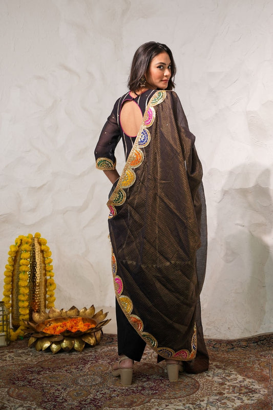 This gorgeous red ensemble from Nidhhi L Mahajan is the epitome of grace and tradition! The intricate embroidery and flowing design add a regal touch. A must-have for any festive occasion!