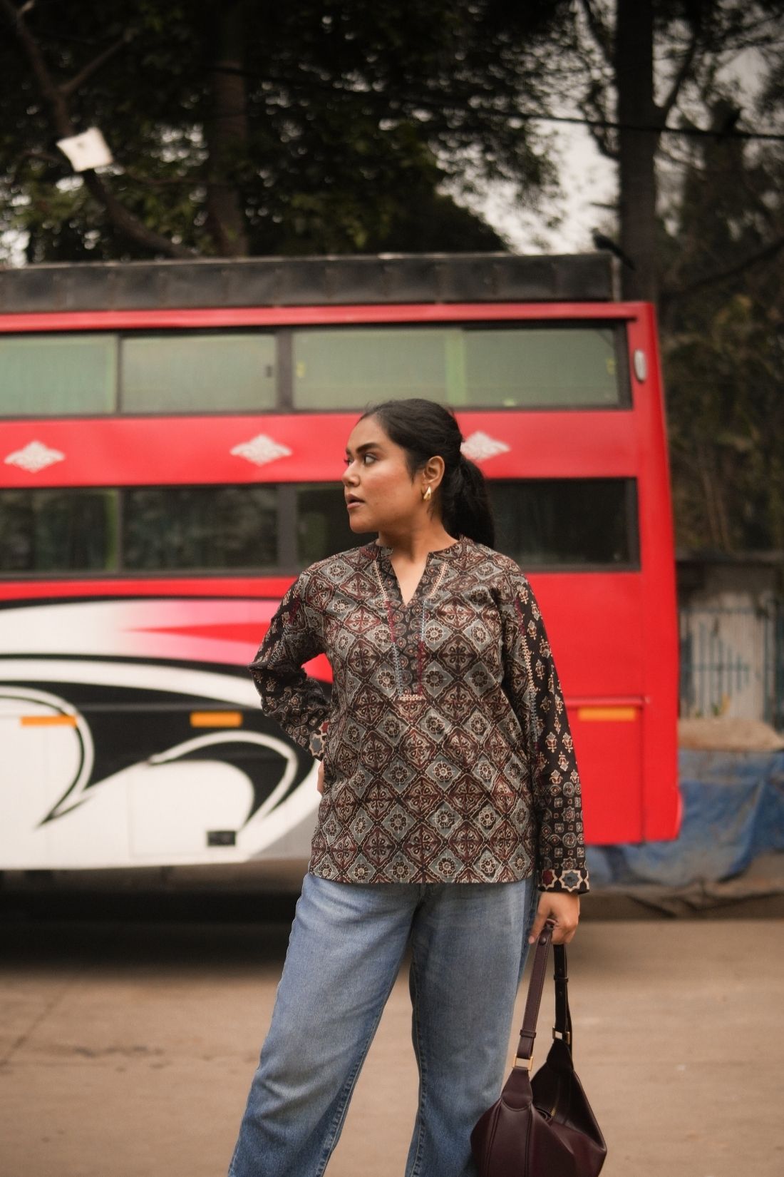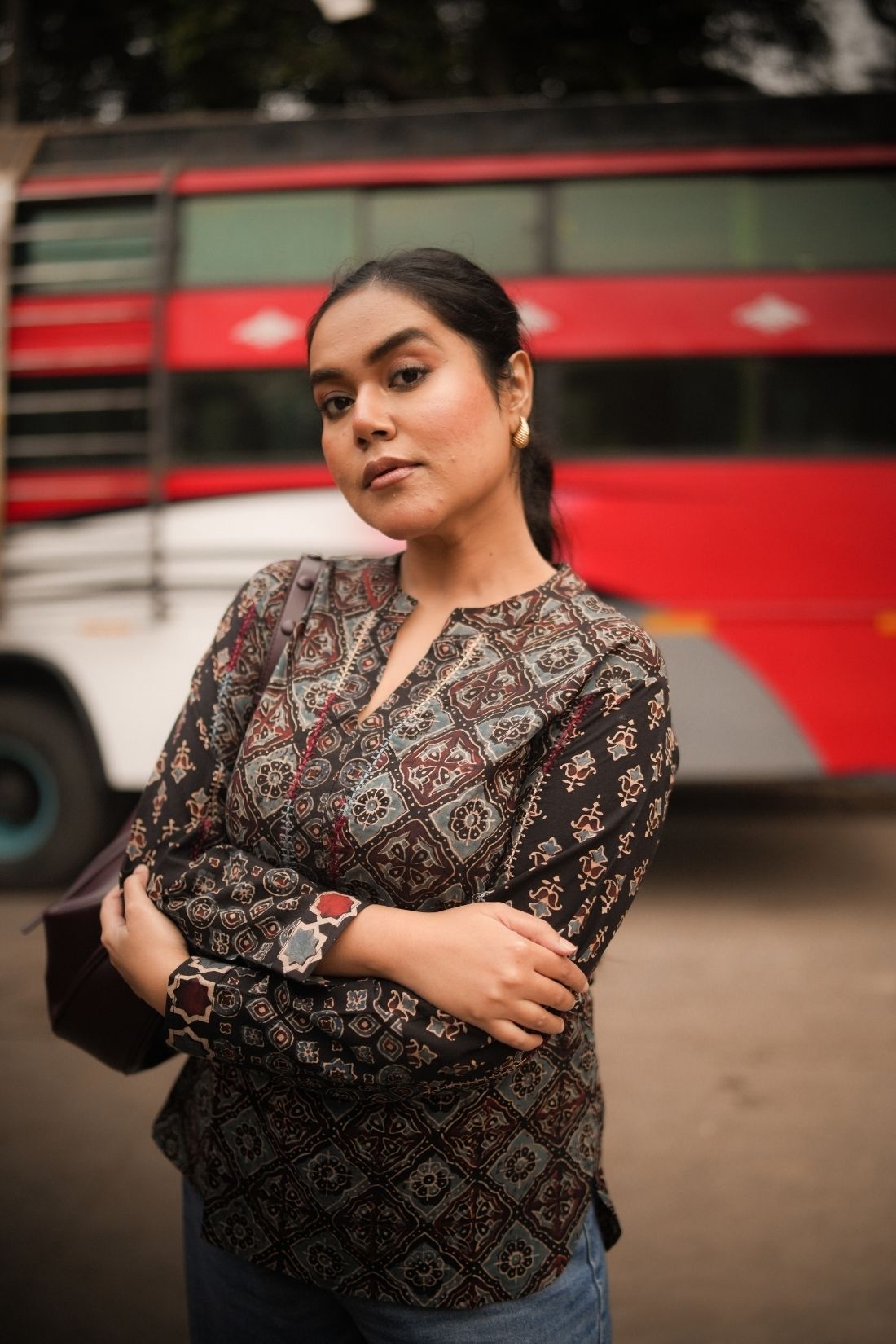 Crafted in breathable pure cotton, this shirt features traditional Ajrakh hand block prints enhanced with delicate embroidery detailing, adding subtle texture and character without compromising on comfort. The relaxed silhouette makes it ideal for all-day wear—whether you’re at work, travelling, or embracing everyday moments in style.