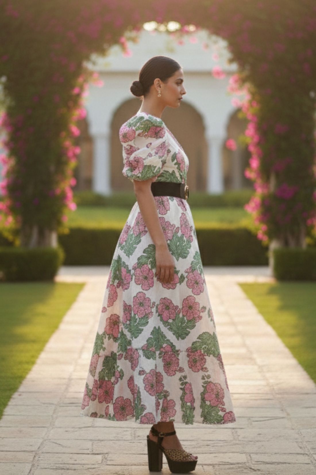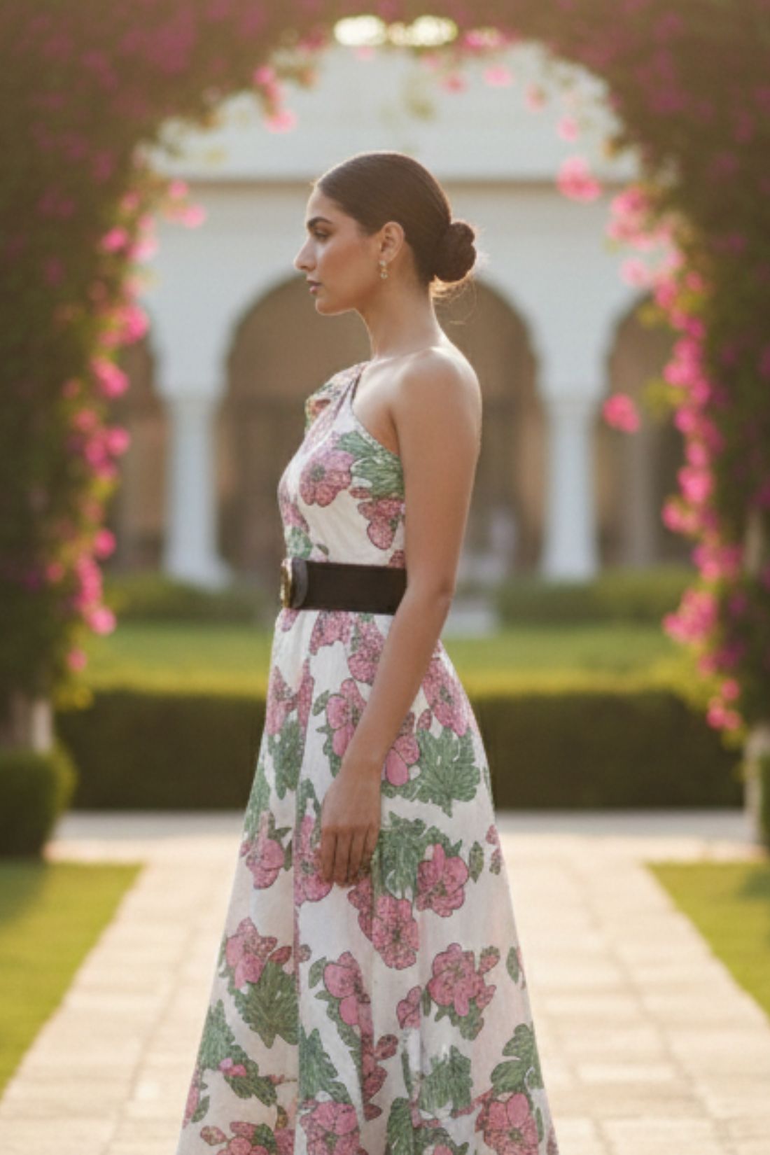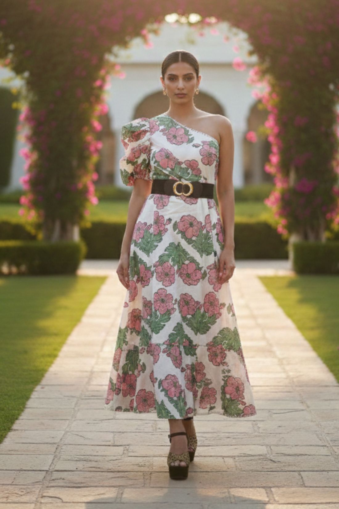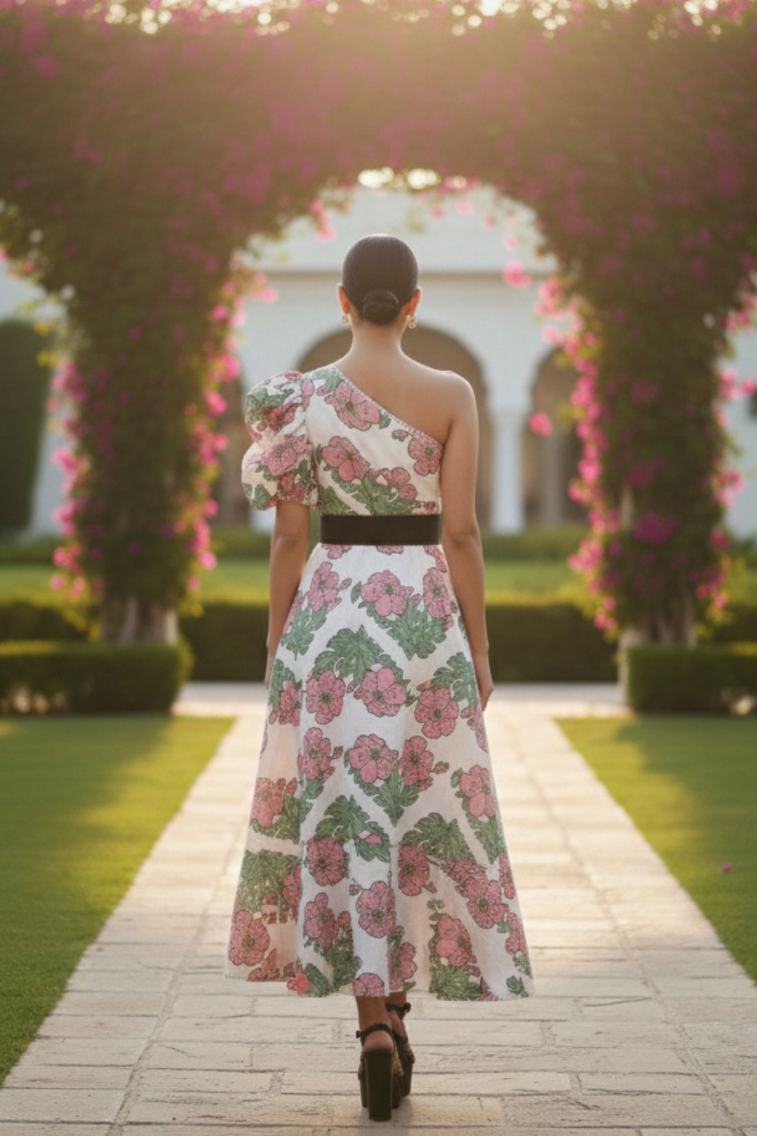 Make a subtle statement with this Handblock Printed One-Shoulder Dress in soft ivory. Crafted in breathable cotton with an attached lining for comfort, the elegant silhouette features a flattering one-shoulder neckline and artisanal handblock prints — perfect for day-to-dusk dressing.