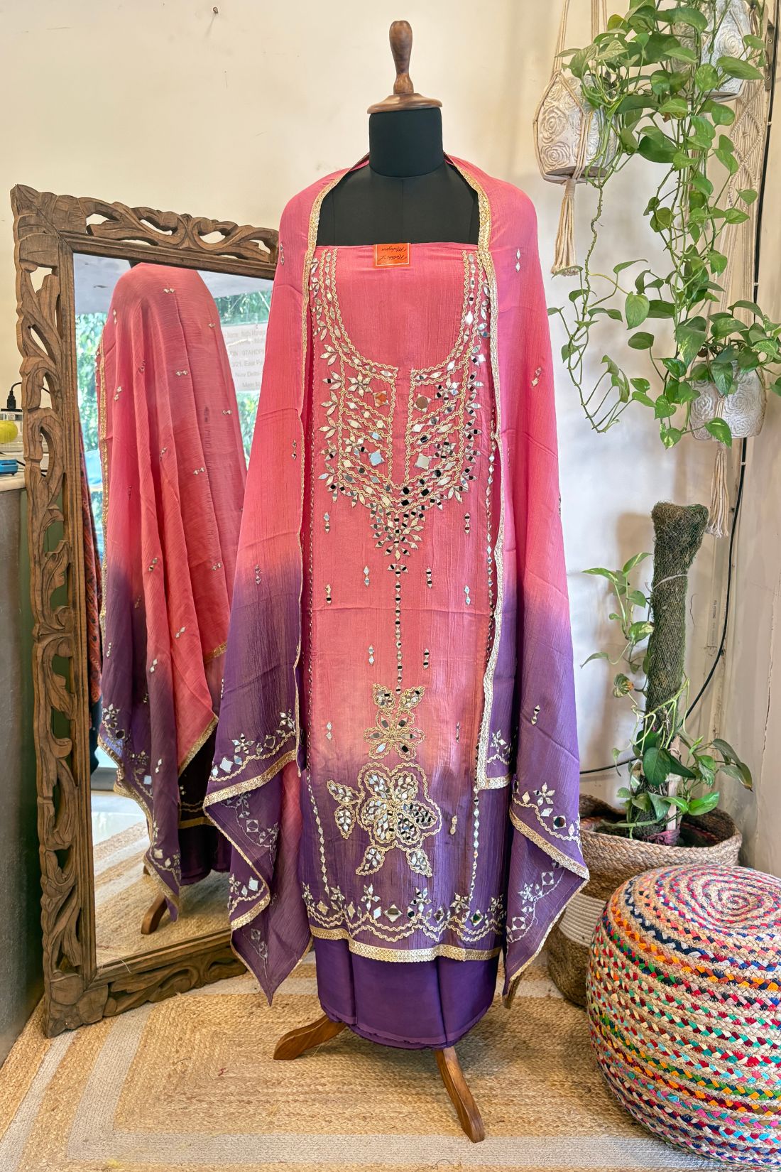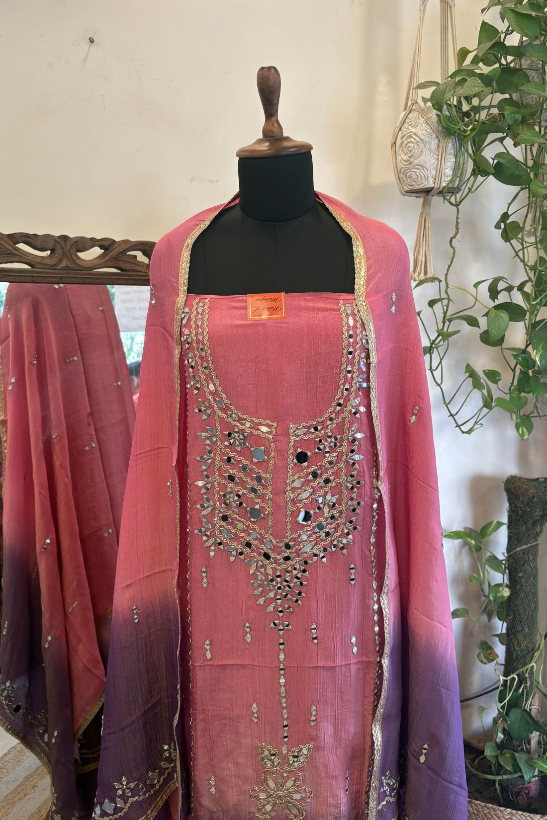 A striking blend of elegance and festive charm, this Pink and Purple Crushed Tissue Suit Set features exquisite mirror and gota work that adds shimmer and traditional detailing to the ensemble. The crushed tissue fabric offers a rich texture and graceful fall, making it perfect for weddings, festive occasions, or special celebrations.