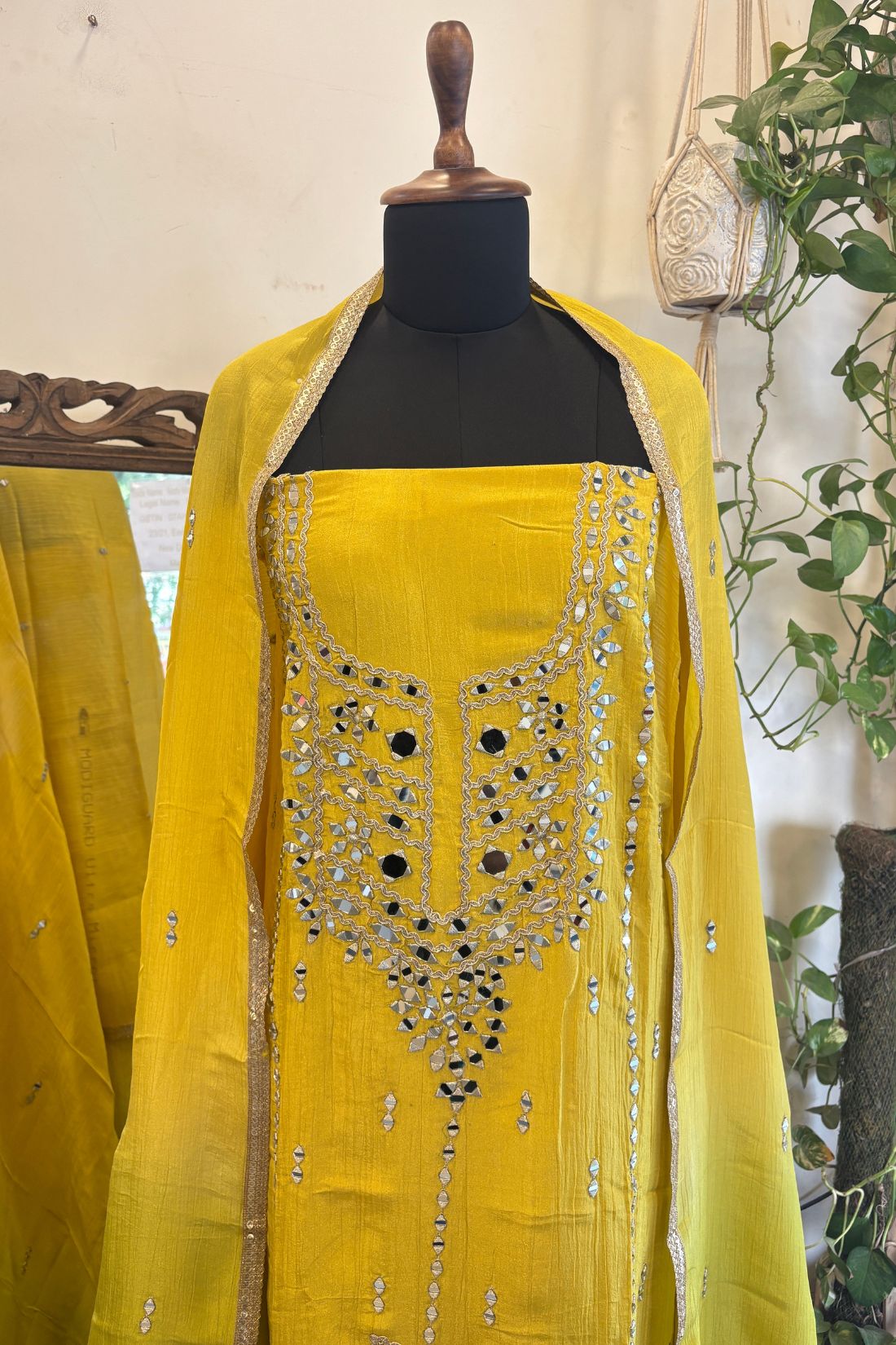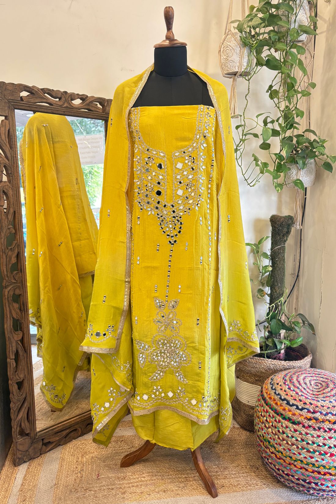 A striking blend of elegance and festive charm, this Yellow and Green Crushed Tissue Suit Set features exquisite mirror and gota work that adds shimmer and traditional detailing to the ensemble. The crushed tissue fabric offers a rich texture and graceful fall, making it perfect for weddings, festive occasions, or special celebrations.
