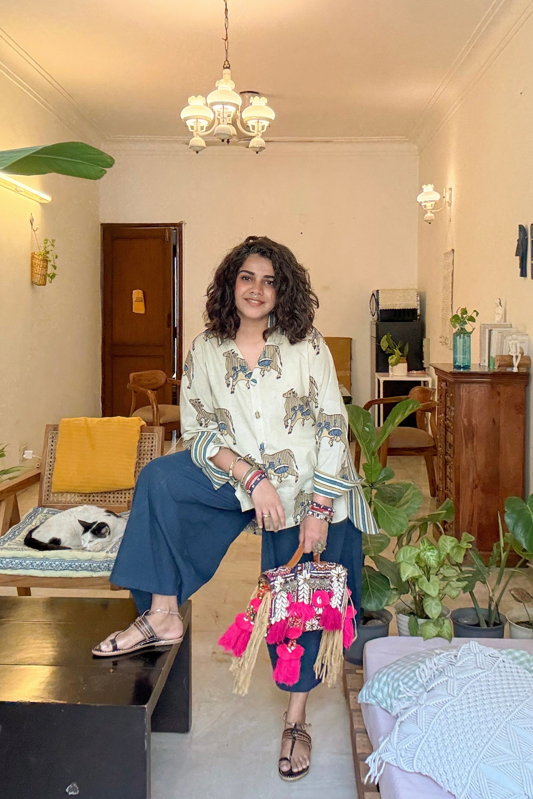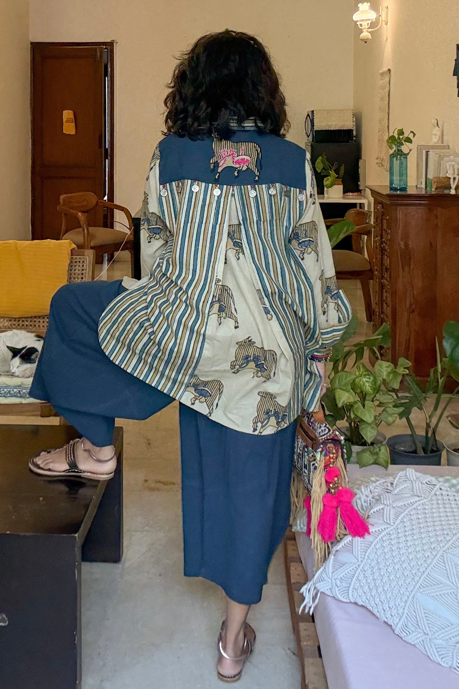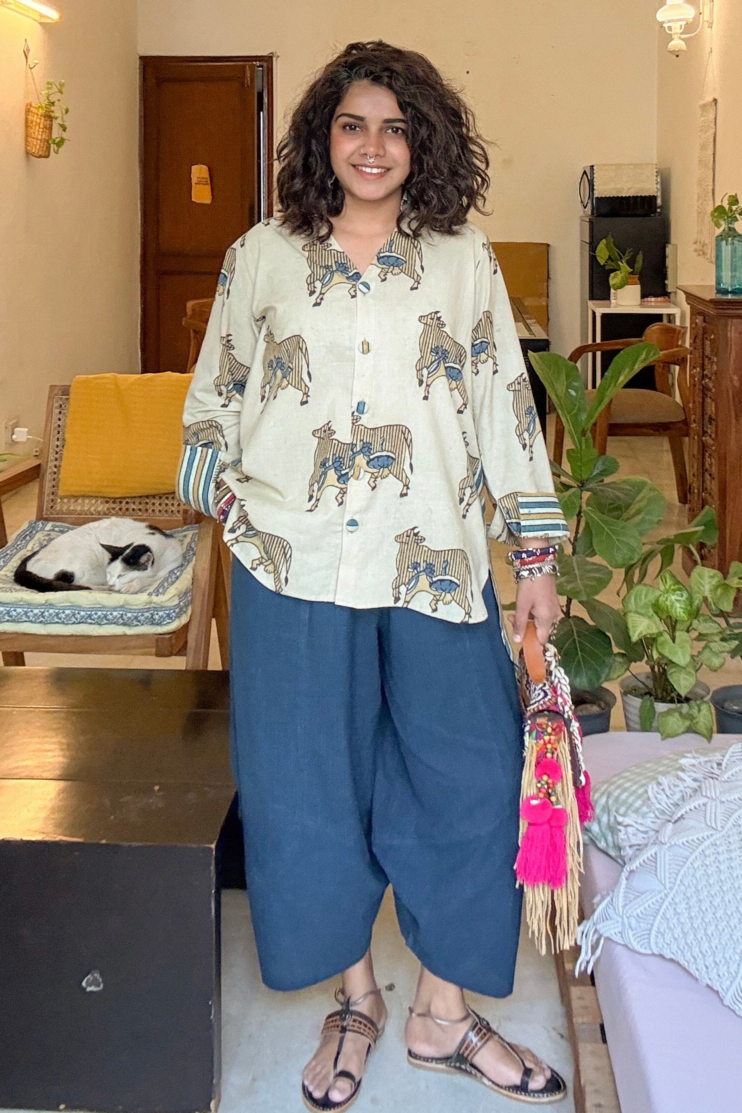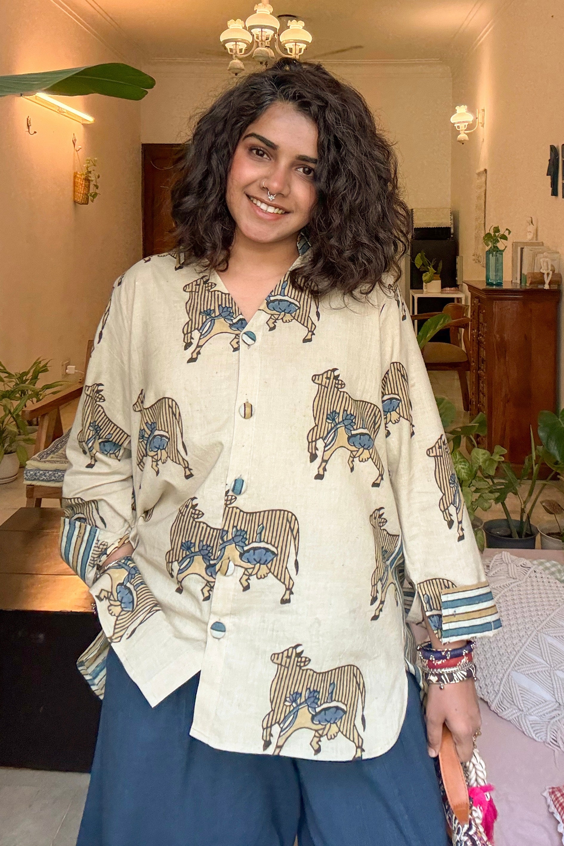 A statement shirt crafted in pure cotton, featuring a unique cow print inspired by traditional Ajrakh aesthetics. Designed for comfort and contemporary style, this piece blends heritage-inspired prints with subtle embroidery for an effortlessly distinctive look.