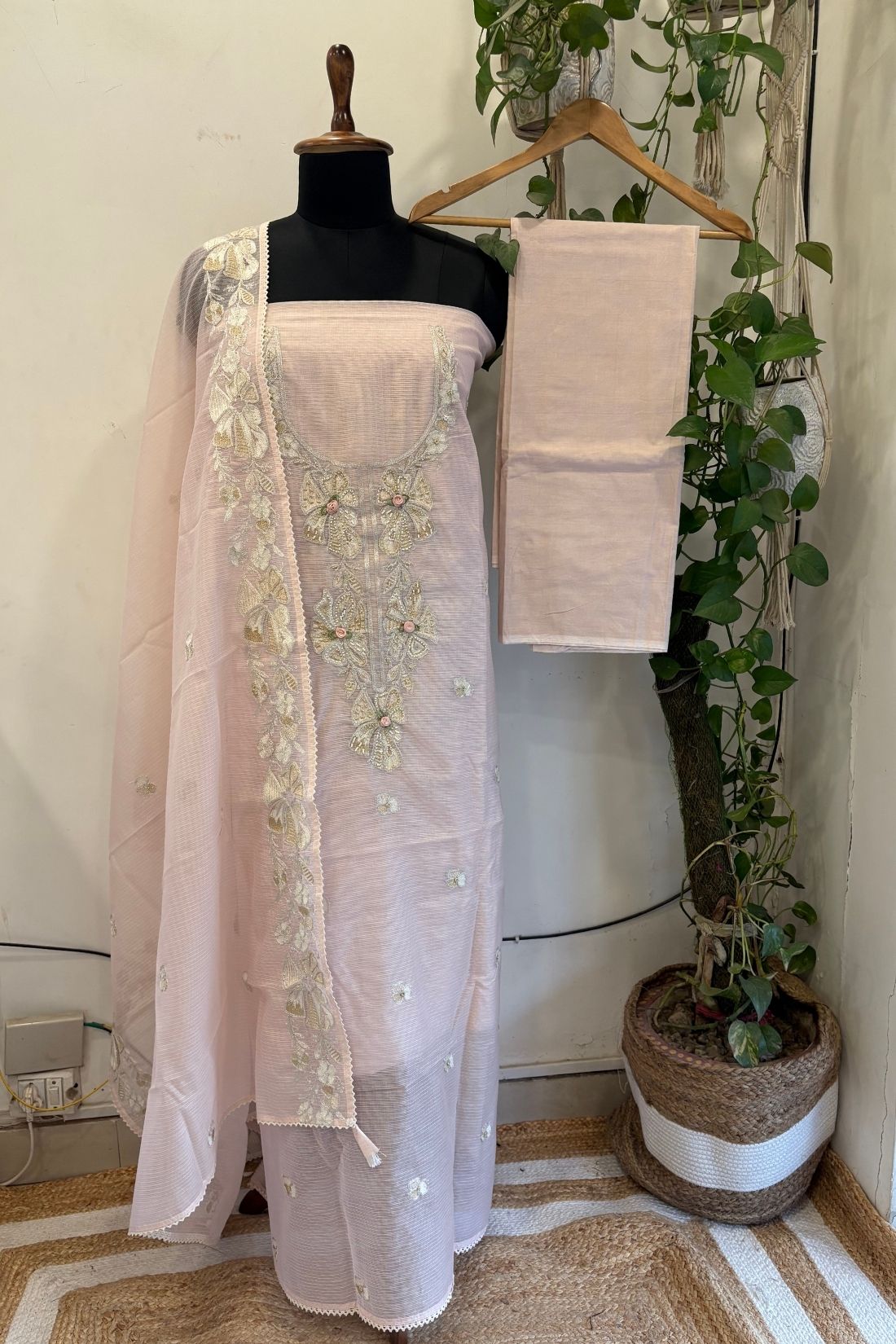 An elegant unstitched suit set in pure and soft original Kotta Silk, adorned with fine embroidery — a perfect pick for festive and formal occasions.