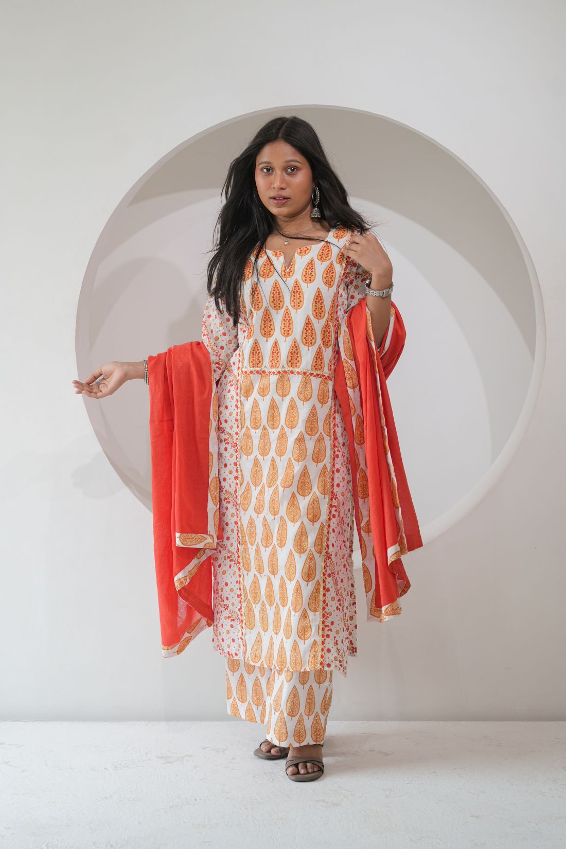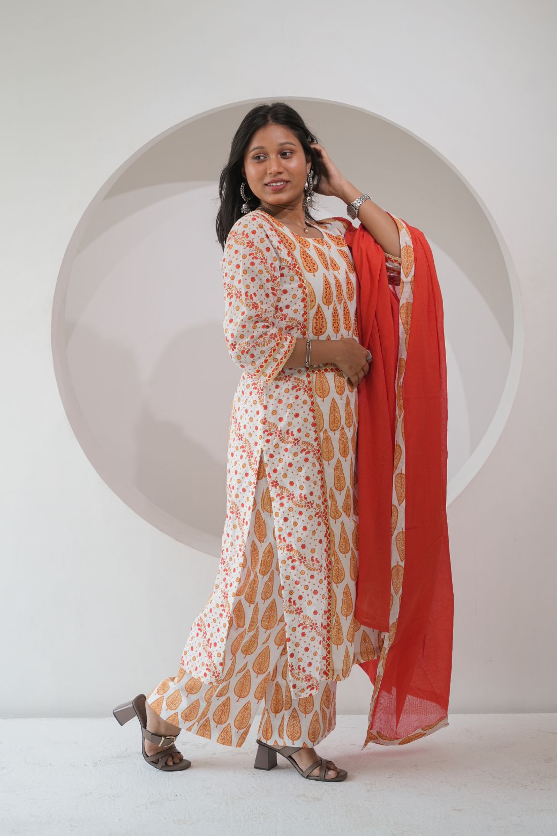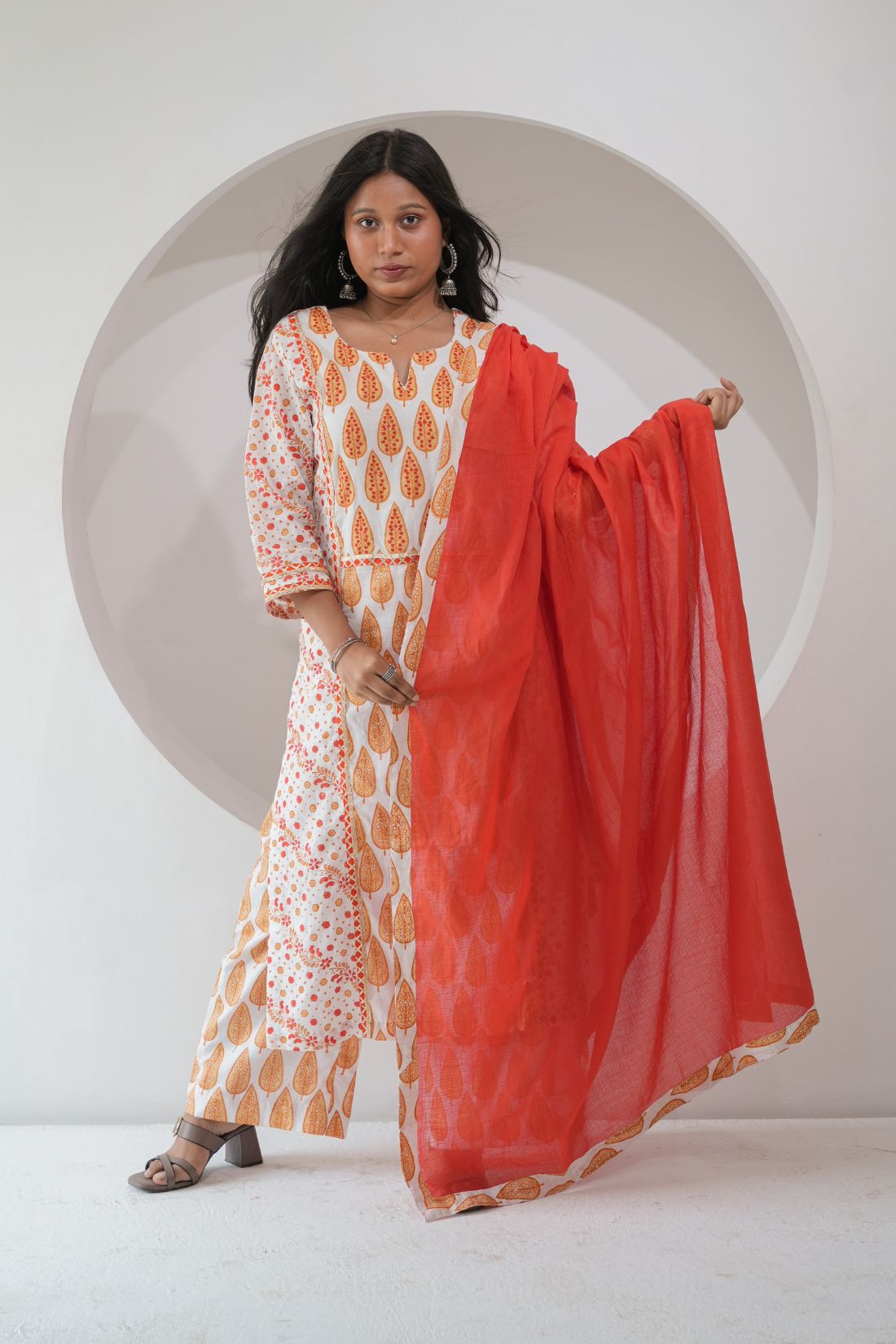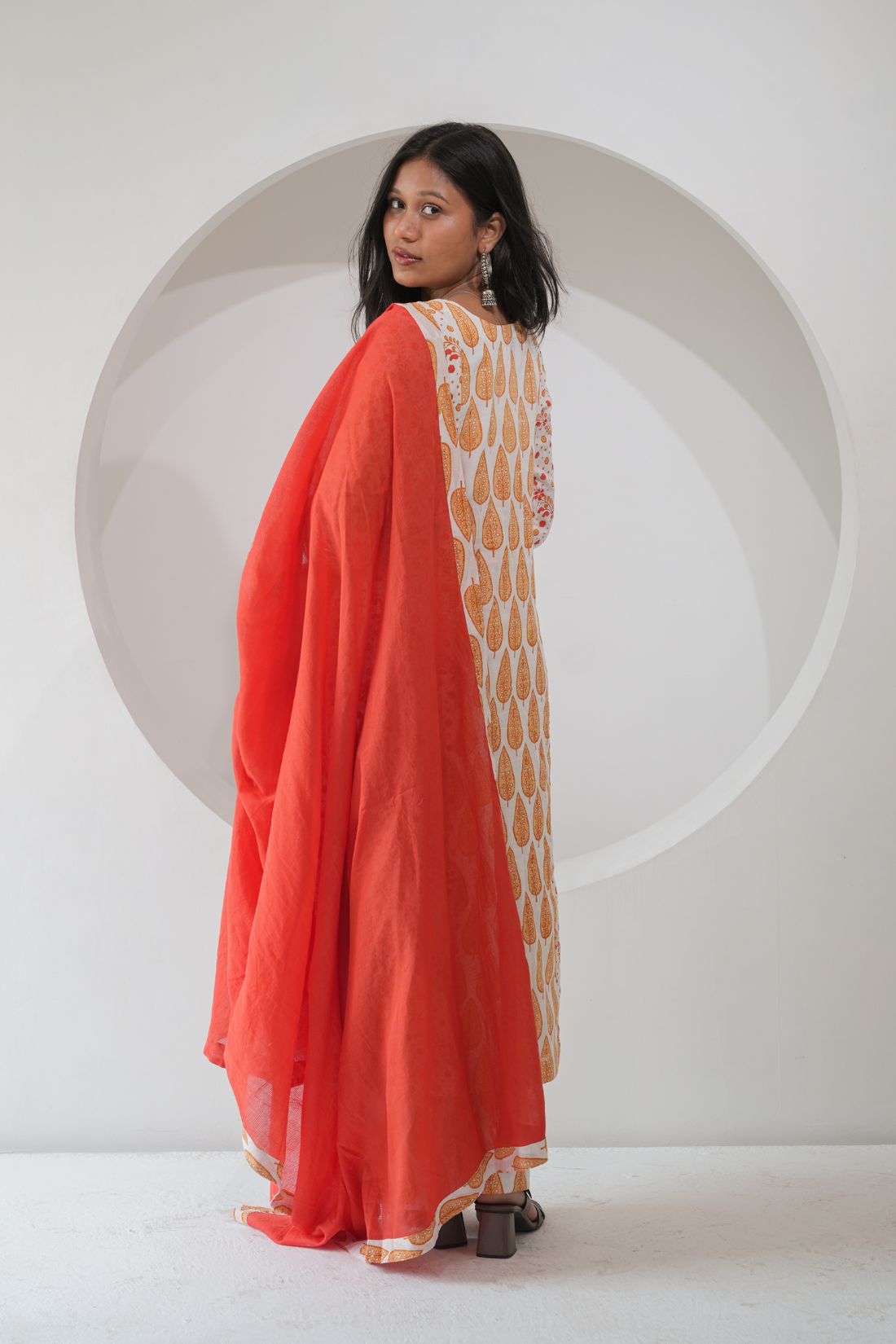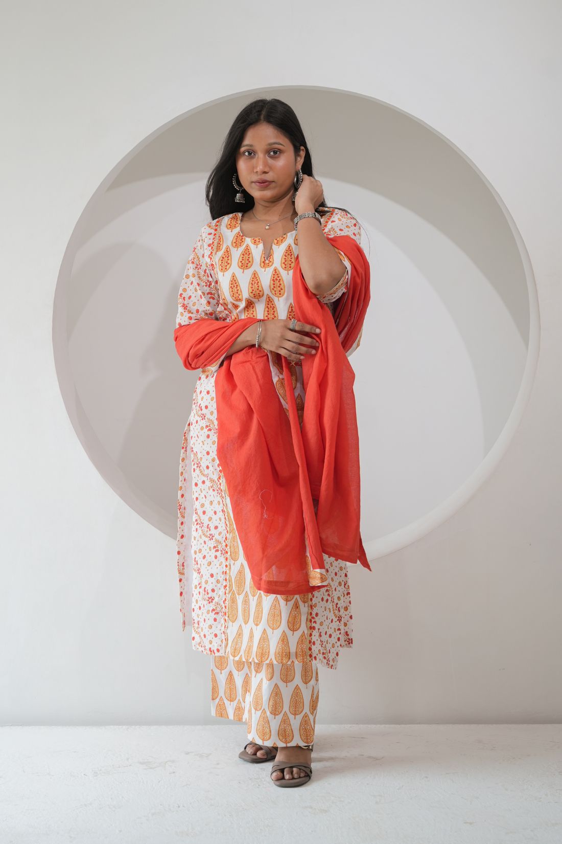 This Mulmul Handblock Printed Suit is a timeless blend of artisanal craft and refined elegance. Featuring intricate embroidery on the yoke and dupatta, and fully lined for comfort and structure, this ensemble is perfect for graceful daytime occasions or intimate festive gatherings.