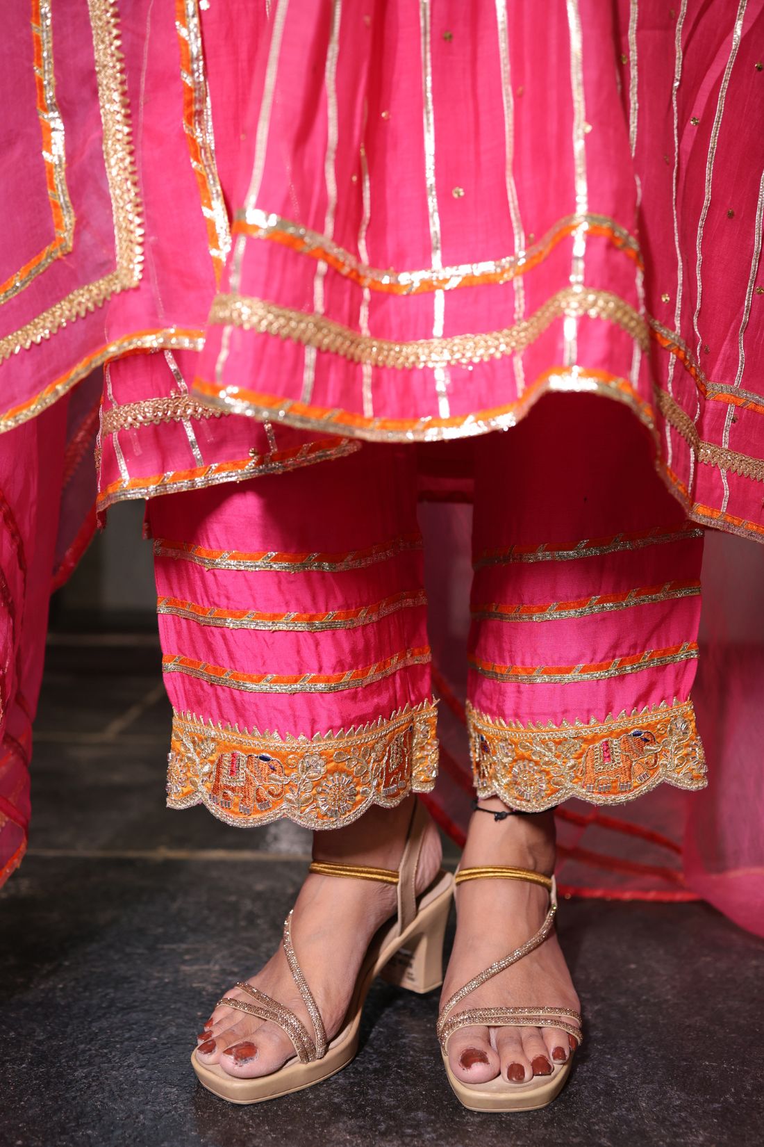 This 3-piece set exudes festive elegance with a rich kurta embellished in intricate dori embroidery and zardozi work, highlighted by a regal elephant motif. The neckline is embroidered and further enhanced with contrast scalloped lace, while the bottom is finished with delicate embroidery and contrast lace edging, bringing harmony to the design.