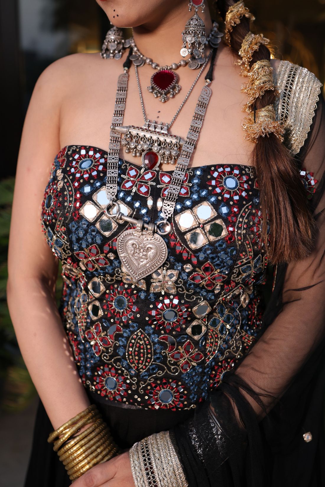 This exquisite Black Mushroo Silk Kali-dar Lehenga is paired with a beautifully embroidered corset and a matching embroidered dupatta, creating a timeless ensemble rooted in craftsmanship.