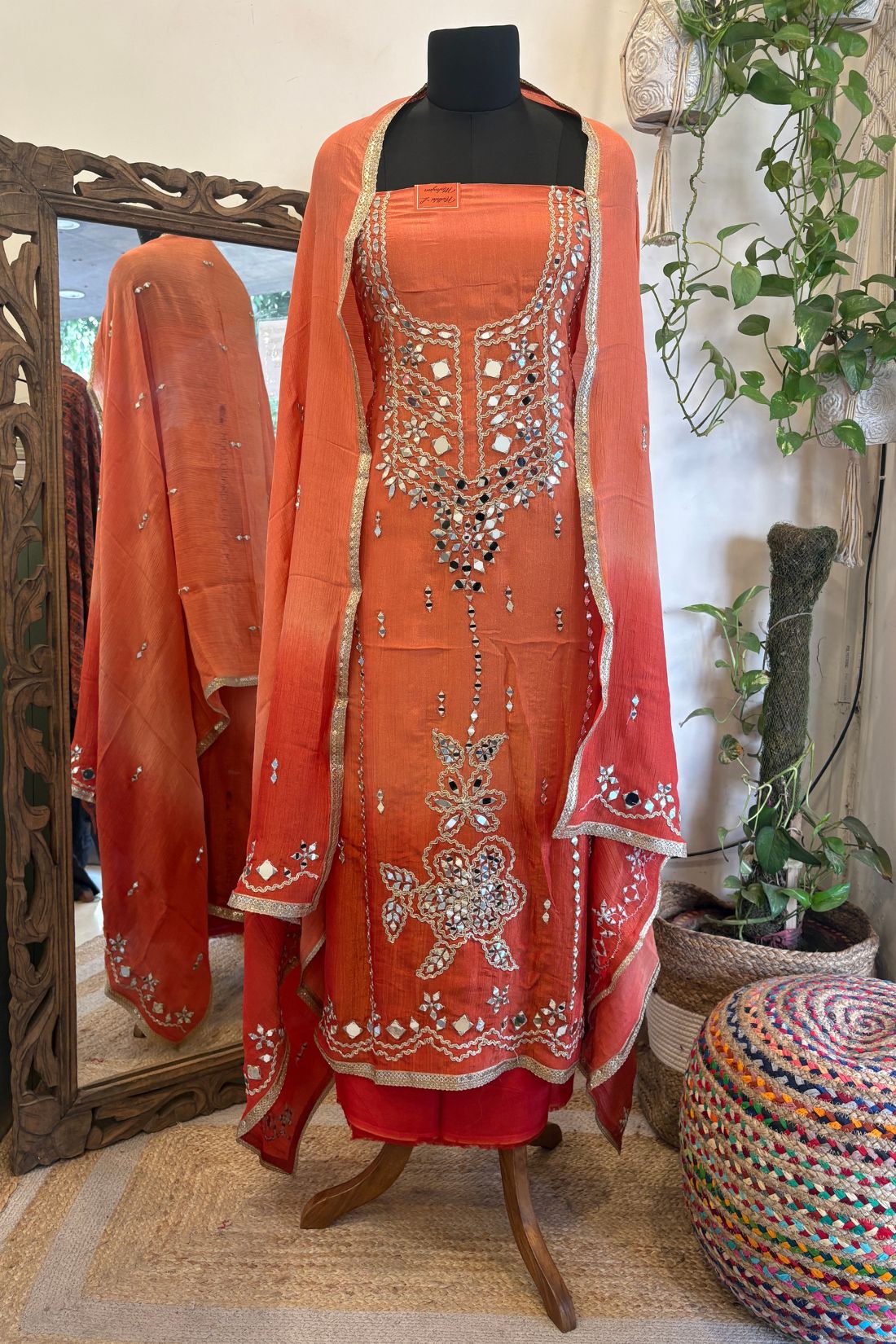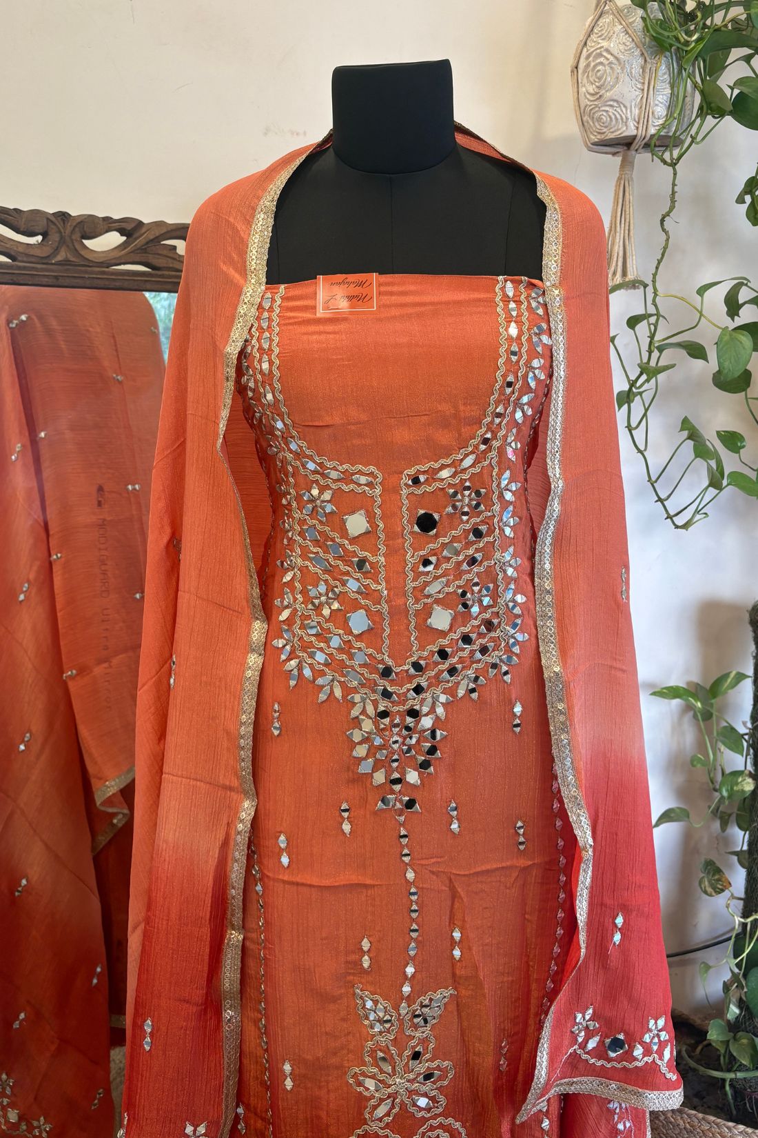A striking blend of elegance and festive charm, this Light Peach and Orange Crushed Tissue Suit Set features exquisite mirror and gota work that adds shimmer and traditional detailing to the ensemble. The crushed tissue fabric offers a rich texture and graceful fall, making it perfect for weddings, festive occasions, or special celebrations.
