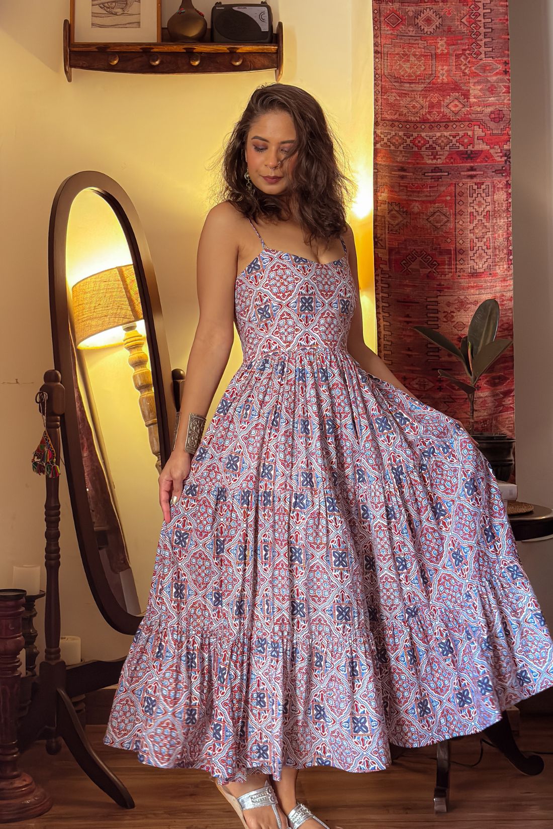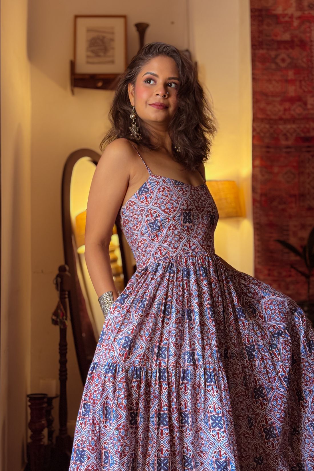 Crafted in soft, breathable cotton, it features a flattering three-tier silhouette that adds beautiful flow and movement. The adjustable straps allow a flexible fit, while the smocked back ensures comfort and proper fitting. Thoughtfully designed with two functional pockets, this dress blends style with practicality.
